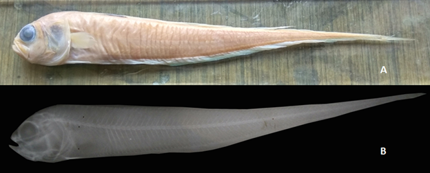 Remarks: The genus Acanthocepola is known to have about 4 species worldwide (Froese & Pauly, 2017). The majority of these species have uniform body coloration, while others have distinct dark bands or spots. A. indica has a close resemblance with Acanthocepola limbata by certain morphological characters and by adult pigmentation. The characteristic of indistinct black blotch on anterior part of dorsal fin between the 7th and 11th dorsal fin rays of Acanthocepola indica separates it from A. limbata (dark red oblong blotch on the dorsal between 9th and 14th dorsal fin rays) and A. krusensternii (blotch absent). Acanthocepola abbreviata have lower number of dorsal fin (D. 67-74) and anal fin rays (A. 67-74) than A. indica (D. 109; A. 98).