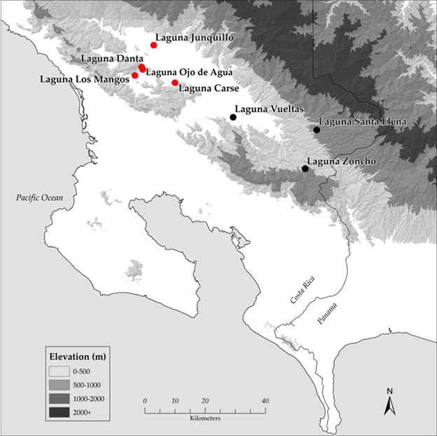 Field work and laboratory analyses were supported by the Initiative for Quaternary Paleoclimate Research at the University of Tennessee; by research funds provided to SPH by a Chancellor’s Professorship and by the Betty Lynn Hendrickson Professorship at the University of Tennessee; and by grants to ENJ from the Biogeography and Paleoenvironmental Change Specialty Groups of the American Association of Geographers, and from the Stewart F. McCroskey Fund at the University of Tennessee. We thank the government of Costa Rica, land owners, and the Térraba indigenous community council for permission to sample lakes, and Matthew Kerr, María José Rivera Araya, María López Rojas, and archaeologists and staff of the Proyecto Hidroeléctrico El Diquís of the Instituto Costarricense de Electricidad for field assistance. We acknowledge the contributions of Theodore Oberlander, who helped us interpret site geomorphology, and of Orlando Vargas Ramírez, who identified the shoreline plant after which we named Laguna Junquillo. Finally, we thank the reviewers and editor, whose suggestions helped us improve the manuscript.