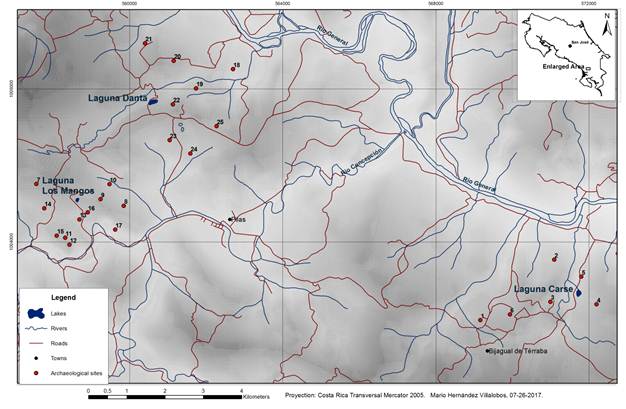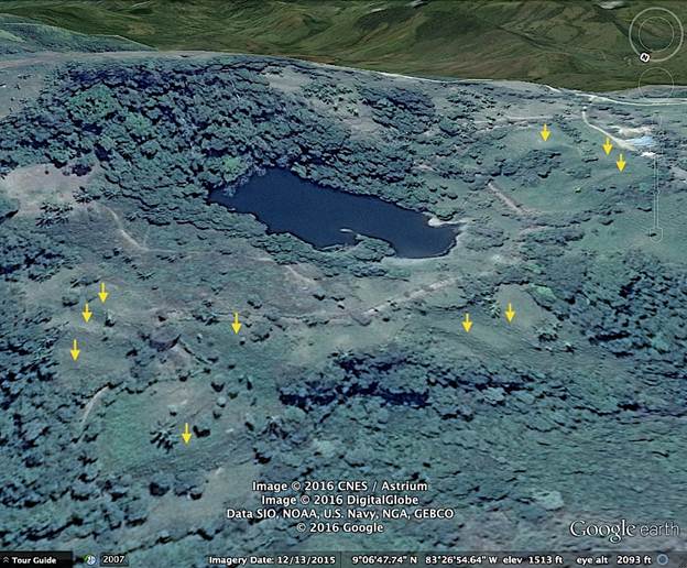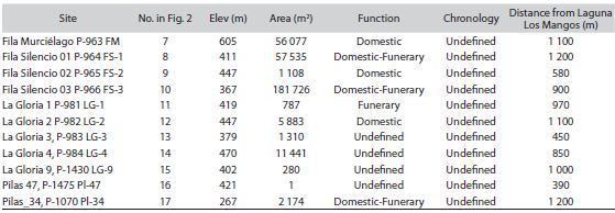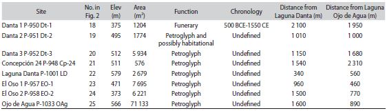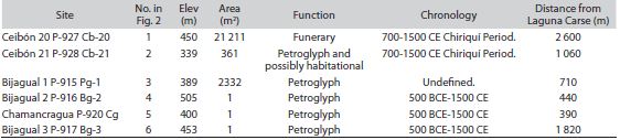 More than two dozen pre-Columbian archaeological sites are located within 1-3 Km of the four natural lakes we surveyed (Fig. 2 and Tables 2, 3, 4). Because we are interested in relationships between archaeological sites and natural lakes, we have not compiled information on sites near the modern artificial impoundment of Laguna Junquillo. Many of the archaeological sites recorded currently have an undefined chronology; however, some structures and artifacts were determined to be associated with the Aguas Buenas (500 BCE-700 CE) and Chiriquí (700-1500 CE) archaeological periods. During our field visits we observed ceramic potsherds near Laguna Danta and a stone axe near Laguna Ojo de Agua. The ceramics we observed correspond to the Aguas Buenas period.