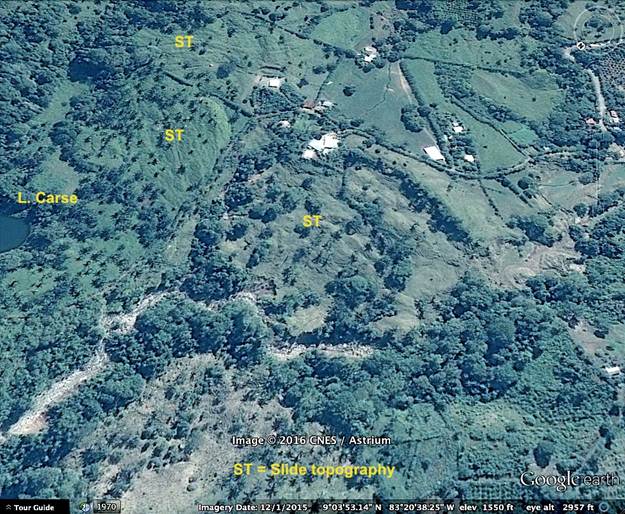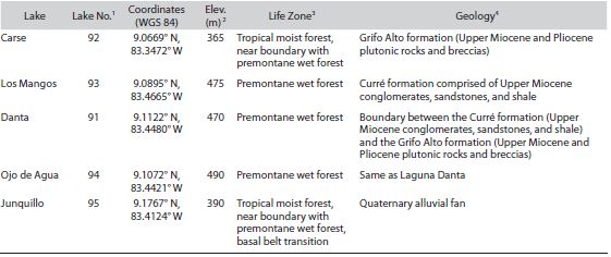 Lagunas Carse, Los Mangos, Danta, and Ojo de Agua are shown on the 1976 IGN topographic map (1:50,000-scale General sheet, Hoja 3543 III, edition 2-IGNCR). These maps were based on aerial photographs that were made in 1973, and indicate that these lakes were present at that time. However, the map shows two lakes at the Ojo de Agua site, where we found only one in our field visit and on imagery available on the Google EarthTM file server. The four lakes south of the Río General range in elevation from 365-490m, and appear to owe their formation to landslides in folded and faulted Tertiary sedimentary and volcanic rocks (Table 1).