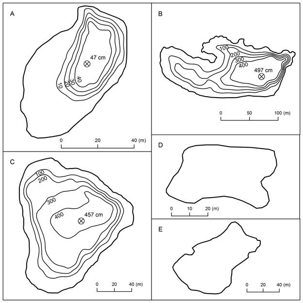 We collected water and sediment samples and made depth and temperature soundings from small boats during visits in June 2013 and March and July 2014. We used a Speedtech portable depth sounder to measure water depths to the nearest 0.1 foot and created bathymetric maps of three of the lakes using a spline function in ArcGIS calculated from our field measurements. Lake areas and perimeters were determined using ArcGIS based on satellite and aerial imagery. We measured temperature with a field meter (YSI model 55), and transparency using a Secchi disk. Surface sediments were collected using a plastic scoop attached to a string of coring rods. From three of the lakes we also collected sediment cores 3-8 m in length using a Colinvaux-Vohnout locking-piston corer (Colinvaux, DeOliveira & Patiño, 1999). Surface water samples for chemical analyses were collected without air and analyzed for major elements and anions at the University of Wisconsin Soil and Plant Analysis Lab using ICP-OES and Ion Chromatography, respectively. We also collected whole water surface water samples to characterize phytoplankton, adding Lugol’s solution as a preservative.