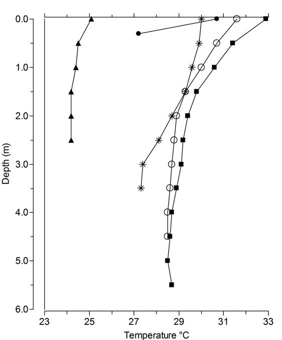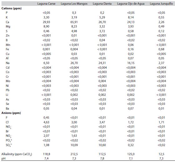 We made temperature readings only in July 2014 and our results (Fig. 6) showed that none of the lakes was stratified at this time. Ojo de Agua was completely covered in floating aquatic plants (mainly Lemna), and showed the lowest temperatures and lowest transparency. Water samples from July 2014 showed that all five lakes were circum-neutral in pH (Table 7). In these lakes the most abundant elements are Ca, Na, Mg, and K, and the most abundant anions are chloride and sulfate, with sulfate levels especially high at Laguna Los Mangos and Laguna Danta. Laguna Los Mangos showed the highest alkalinity.