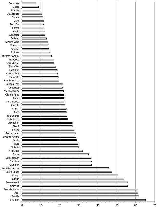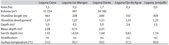 Three of the natural lakes we sampled, Lagunas Danta, Ojo de Agua, and Carse, were mentioned in a 2005 inventory of water bodies in Costa Rica that emphasized the development of fishing and aquaculture (PREPAC, 2005), and in an earlier compilation by government agencies (Córdoba Muñoz et al., 1998). These sources list the area of Lagunas Danta and Ojo de Agua as 5 and 0,5ha, respectively, values two to three times higher than we determined in our analysis using ArcGIS, but the area they list for Carse (1,5ha) matches our determination. While the PREPAC inventory team visited both lakes, they did not collect limnological data or samples. The earlier lake inventory (Córdoba Muñoz et al., 1998) seems to have included very little field work, but did list a depth for Laguna Danta of 3m. The source of this datum is not clear; we measured a maximum depth of 5m in June 2013 and at least 4.7m in March 2014. Whether the depth of 3m represents an actual measurement or an estimate based on conversations with locals is unknown. Citing the 1998 report, PREPAC (2005) also reported 3m as the depth of Laguna Danta, but presented the value as a mean depth. This is a typographical error because in limnology mean depth is not an observation, but a variable calculated by dividing the volume of a lake by its surface area. From our GIS and bathymetric analyses we calculate the mean depth at Laguna Danta to be 2m (Table 5).