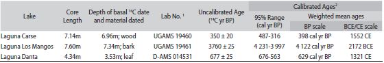Radiocarbon dates on plant remains in our sediment cores provide evidence of the timing of the landslides that formed the lake basins (Table 5). The deepest macrofossils we have dated in these cores provide minimum ages for the lake sediment records, and for the landslide events that formed the basins. These ages indicate lake formation prior to ca. 400 cal yr BP (calibrated years before CE 1950) at Laguna Carse, that is, before the year 1550 CE in the CE/BCE time scale. Laguna Danta formed before 630 cal yr BP (1320 CE). Laguna Los Mangos, which also appears to have formed in connection with land slumping or sliding, formed much earlier than the other lakes investigated. The lowest plant macrofossil we dated in the sediment core yielded a radiocarbon date that corresponds to 4120 cal yr BP (2170 BCE). Laguna Ojo de Agua, which we did not core, has a basin morphology and setting that also suggests formation associated with a landslide event.