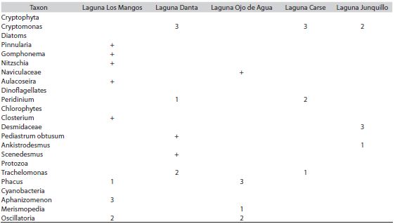 Phytoplankton samples from the five lakes included genera that were previously reported in other shallow, low-altitude Costa Rican lakes (Haberyan, Umaña, Collado, & Horn, 1995), but not as dominant genera. For example, we found Phacus to dominate Laguna Los Mangos (Table 8), but in the wet-season survey of 30 lakes by Haberyan et al. (1995) this genus was uncommon in the four lakes in which it occurred, ranking as the fifth most dominant taxon in only one lake. Similarly, Ankistrodesmus was a widespread, subdominant (rank 2-4) genus in the earlier survey, but we found it to dominate Laguna Junquillo. With the notable exception of the detailed weekly sampling of phytoplankton at several lakes by Umaña (2010, 2014, 2016), most sampling of phytoplankton in Costa Rican lakes has been episodic or limited to a single visit, hampering understanding of phytoplankton ecology. Sampling at higher frequency and across multiple seasons at more lakes will be required to document relationships between phytoplankton and lake characteristics across climate and ecological zones of Costa Rica.