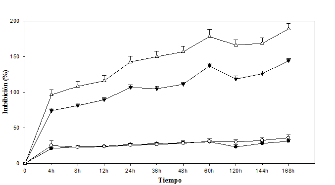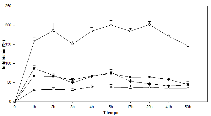 Los resultados de la Figura 3 muestran que el embrión de Byrsonima crassifolia absorbe agua en mayor cantidad que la testa. Se observó que cuatro horas después de iniciado el experimento, la testa presentó 39,08% de imbibición; comparando éstos resultados con los de la Figura 1, se observa que un endocarpio completo sin escarificación, en el mismo tiempo absorbe 18,09% menos que la testa; sin embargo, fue interesante observar que cuando se evaluó el embrión solo, después de la primera hora, absorbió 86,60% de su peso, después mantuvo un descenso; posteriormente, a las 3h nuevamente inicia un incremento hasta las 5h, y después se presenta un fuerte descenso de manera constante, situación que no se pudo observar en el experimento 1 y 2.