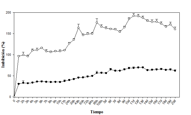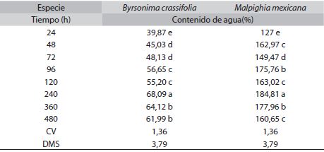 Segundo experimento: La cinética del lote de endocarpios sumergidos en el agua mostraron diferencias estadísticas entre el tiempo y la cantidad de agua imbibibida (α=0.05) (Cuadro 2); las dos especies alcanzaron la máxima imbibición a las 240h pero con descensos intermedios, donde Byrsonima crassifolia presentó una disminución y Malpighia mexicana dos, siendo a las 48h la primera y a las 120h la segunda, además de que ésta especie imbibió 3 veces más agua que Byrsonima crassifolia.