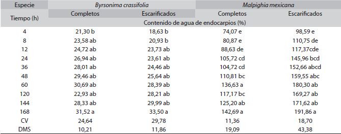 Primer experimento: La cinética registrada en los endocarpios de las dos especies, mostraron diferencias entre el tiempo y la cantidad de agua imbibibida (α=0.05) (Cuadro 1); donde, en las primeras 4h de absorción se alcanzó hasta 21,30 y 74,07 % en semillas completas; mientras que, en los endocarpios escarificados fue de 18,63 y 98,59%, cabe mencionar que son especies diferentes, lo que generó dichos resultados. Los endocarpios de Byrsonima crassifolia son de testa dura y leñosa, considerando éste factor se encontró que estadísticamente no hay diferencias significativas en que imbiban 8 ó 68h; sin embargo, hasta las 60h fue donde la absorción fue continua y, posteriormente se encontró disminución de peso hasta las 144h. Los endocarpios escarificados hasta las 12h presentaron imbibición continua, luego disminución y aumentos pero sin diferencias estadísticas; por otro lado, en endocarpios completos se alcanzó a observar una fase de la cinética del agua, y, en los escarificados dos, incluyendo a la tercera que originó la emergencia de la radícula de la plántula.