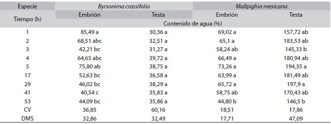 Tercer experimento: La cinética del agua en embriones y testa de las especies evaluadas registraron diferentes tasas de imbibición en poco tiempo (α=0.05) (Cuadro 3). El embrión de Byrsonima crassifolia en la primera hora imbibió 85,49% de agua en relación a su peso, no mostrandose aumentos superiores a éste en el tiempo, pero sí descensos con diferencias estadísticas; además, durante las 53h de evalución se encontraron tres fases con aumentos y disminuciones constantes, donde naturalmente había activación interna para el desarrollo del embrión, y la testa o barrera protectora del endocarpio absorbió hasta 39,72% de agua; Por otro lado, los embriones de Malpighia mexicana imbibieron 69,02% durante la primera hora de iniciado del experimento, luego disminuyó durante las 2 y 3h, con recuperación a las 5h pero sin diferencias estadísticas, excepto a las 53 h donde ya hubo mayor disminución y daño del embrión; la testa del endocarpio de ésta especie alcanzó valores de hasta 197,9 %, absorbiendo altos porcentajes, como resultado de su morfología.