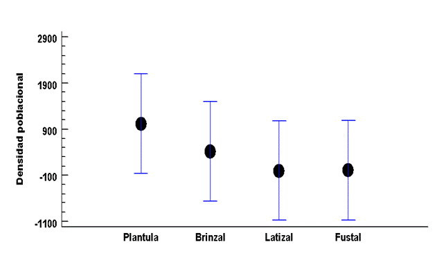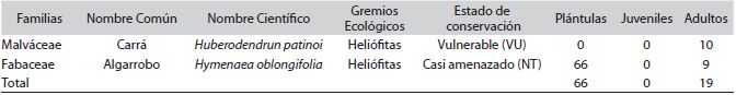 De la especie Huberodendron patinoi solo se encontraron individuos en estado Fustal, mientras que Hymenaea oblongifolia registró individuos plántulas; Brinzal y Fustal. (Cuadro 2). Sin embargo, esta cantidad de plántulas que presentó H. oblongifolia podría disminuir drásticamente, se encontraron una cantidad de individuos con hongos, en muy mal estado por no recibir los nutrientes suficientes y por estar expuestas a la depredación de roedores.