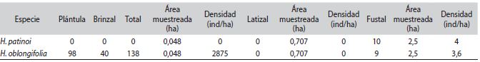 Las especies en estudios tienen gran potencial económico por su madera de gran calidad, dureza, resistencia y densidad, y por ello son altamente comercializadas en los mercados locales y nacionales. Autores como Janzen (1970) manifiesta que las plantas que crecen alrededor de los árboles madres son más susceptibles a obtener patologías, y a su vez sirven de alimentos para distintos tipos de animales. Por otro lado, las plántulas de H. oblongifolia se encontraron cerca del árbol madre, lo que concuerda con lo afirmado por Hartshorn (1983) quien dijo que la regeneración natural es muy abundante en las cercanías del árbol madre.