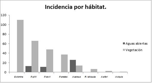 Un evento de relevancia es el primer reporte de la presencia del género Cynodonichtys en el sitio, específicamente en charcas temporales cerca de la laguna, siendo la zona más cercana donde se ha reportada el Río Sarapiquí, a una distancia de 4Km de la laguna. Además, se informa de la presencia de A. siquia en la laguna Congo, que a pesar de la cercanía con la laguna Hule, no fue encontrada en la misma durante todos los meses de muestreo. Relacionado con la elección de hábitat (Fig.1), se determinó que las especies A. alfari, P. amates, P. gillii (t-test (p<0.05)) y P. dovii (Wilcoxon (p>0.05)) muestran una tendencia marcada a vivir resguardadas entre la vegetación acuática o de la orilla, mientras que A. aeneus posee una preferencia hacia aguas abiertas (t-student (p<0.05)).