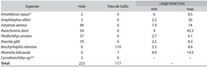 La abundante cantidad de vegetación acuática condicionó el muestreo a los siguientes artes de pesca: líneas de pesca, redes y chinchorro de diferente luz de malla. Se muestreó en la orilla expuesta y entre la vegetación un tramo total de aproximadamente 800m, mismos que se dividieron en ocho secciones de diez metros cada una, en promedio se muestreaba durante 20min en cada sección. Los peces capturados fueron identificados in situ utilizando la clave taxonómica elaborada por Bussing, (1998), se midió su longitud estándar (LT) usando un ictiómetro (±1mm) o una regla plástica (±0,5mm) cuando su tamaño lo condicionaba y se liberaron en el mismo sitio donde se capturaron. Además, se verificó el sexo de los poecílidos.
