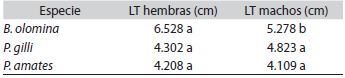No hubo diferencia entre el tamaño promedio de los sexos para P. gillii y P. amates (Welch Two Sample, t-test (p>0.05)), caso contrario B. olomina si presentó diferencias (Welch Two Sample t-test (p<0.05)). En general, las hembras de B. olomina y P. amates presentaron mayores tallas, al contrario que con P. gillii (machos de mayor tamaño) (Cuadro 2).