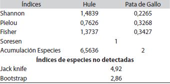 Los índices de diversidad en los dos sitios muestran que esta es baja, siendo la Laguna de Hule la más diversa de las dos; el índice de equidad de Pielou refleja una dominancia bastante repartida en la laguna; mientras que en la quebrada la alta dominancia por parte de una especie es muy notable. Ninguna de las especies encontradas en la quebrada estaba presente en la Laguna de Hule y viceversa, aspecto que se confirma con el índice de disimilitud de Soresen. La curva de acumulación de especies señala que la mayor parte de estas fue hallada en la laguna. Según los índices de especies no detectadas, faltaron de tres a cinco de encontrar en los sistemas de agua dulce muestreados (Cuadro 3). Los problemas de origen antropogénico encontrados se resumen en el Cuadro 4, así como sus riesgos y posibles soluciones.