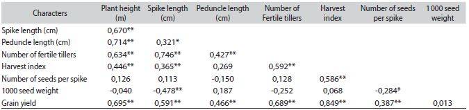 Most characters were positively correlated, while elation, 1 000 grain weight and spike length had a negative correlation (Table 1).