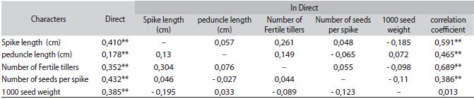 Direct and indirect effects of path analysis appear in Table 2. Seed yield had statistically significant direct effect on the spike length, peduncle length, number of fertile tillers number of spikes and 1000 seed weight. Number of seeds per spike had direct positive effect (0,432), and showed high share on seed yield that in turn had indirect relationship on number of seeds per spike. The positive effect of spike length (0,046) and the number of fertile tillers (0,044), while indirect effects of other characters was detected in a negative way (Table. 2).