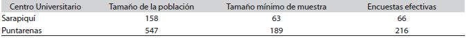 En el caso del CEU de Sarapiquí se obtuvo una población de 158 estudiantes inscritos a lo largo de los tres cuatrimestres y en el caso de Puntarenas 547 estudiantes (Cuadro 1).