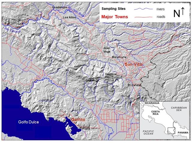 The material selected for analysis is associated with varied environments that characterize the southern Pacific zone: coastal sites (Alto Purruja), piedmont (El Cafetal), alluvial valleys (Iglesia de Guadalupe), savannas (Los Altos), and mountain ridges (Gamboa, Juan Vega, and Manchuria). The functionality of the selected sites corresponds to households at Los Altos, Gamboa, Juan Vega and El Cafetal. Alto Purruja is a coastal site associated with the consumption of resources from shoreline and offshore habitats. The Iglesia de Guadalupe is a colonial seat of the Spanish crown, where a church was constructed that controlled the indigenous population.