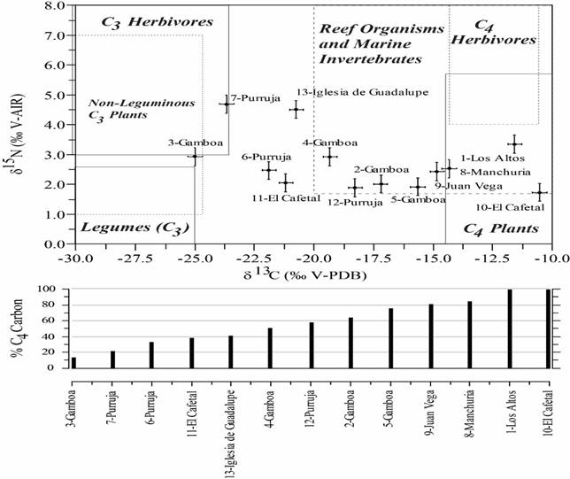 Sample 12, from a third piece of ceramic from the Alto Purruja site, shows an even split between C3 plants and C4 plants, and again no evidence reef or marine invertebrates. Sample 13, a food residue sample from the colonial church of Guadalupe, suggests a composition split between C3 and C4 plants, along with possible herbivore flesh as indicated by the high δ15N values.