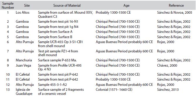 Twelve of the thirteen samples are prehistoric pottery vessels that range chronologically from 700 to 1500 AD (Table 1). One sample comes from a colonial site and corresponds to the period from 1571 to 1660 AD. Most of the samples came from defined contexts and were recovered in controlled excavations; however, to enlarge the data set a few vessels from surface reconnaissance were included.