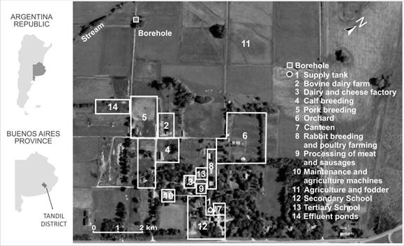 Those from the dairy farm and cheese factory were the most relevant for the environment given their volumes and chemical composition. At the dairy farm, effluents with a high organic load are mainly generated by cleaning of the building and animal track. Water employed for these cleaning activities comes from the reuse of water from the milk refrigeration system. In turn, the effluents from the dairy and cheese factory have different components depending of the step of the productive process. The major volume is originated in the separation of buttermilk and is disposed as food for the pigs. Another kind of effluents is composed by a mixture of milk, buttermilk, and rests of cheese coming from the cleaning of the building and equipment. Furthermore, liquid waste from salting pools with a high salinity is drained once a year. The effluents are collected through pipes and drains, which are affected by breaks and losses, conducted toward a first artificial pond and, then, to a second pond by overflow. These two stabilization ponds lack of any treatment or depuration, which could compromise water quality. No data exist about their functioning. Finally, the liquid effluents are conducted by gravity through a channel to a nearly stream. From the reasons discussed, it was evidenced that the effluent treatment system resulted inadequate and deficient. We did not observe a hydraulic linking between the ponds and the supply borehole, but if groundwater extraction rate is not diminished, the cone of depression of the phreatic aquifer will affect by interception the effluent discharged area, thus causing severe drinking water pollution.