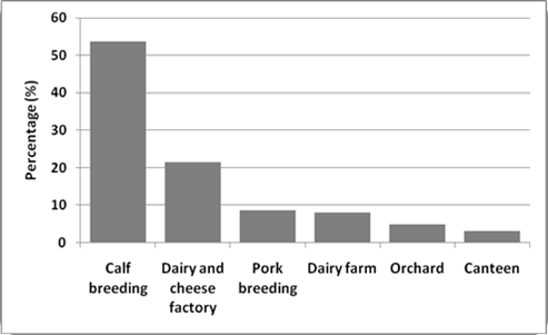 The distribution per sectors is shown in figure 2. The highest amount of water was consumed at the area devoted to calf breeding (~54%), followed by the dairy-cheese factory (~22%). In the former, water is mainly used for the process of milk cooling through a hose system working 24 hours/day, while, in the latter, water is mainly employed in a boiler and in the cleaning of floors/allowances.