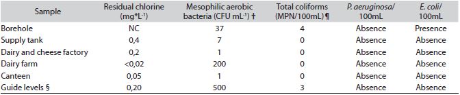 Microbiological analysis: Five groundwater samples were collected from six selected sectors for laboratory determination of pathogen microorganisms. Four samples were collected from the water distribution network at the school, namely, supply tank, dairy-cheese factory, dairy farm and canteen. One additional sample was collected directly from the borehole supplying water to the whole network. The presence of pathogen agents regulated by the Argentinean Alimentary Code for human consumption: mesophilic aerobic bacteria, total coliformes, Escherichia coli, and Pseudomonas aeruginosa, was analyzed. These pathogens should be absent or below guide values in order to consider water suitable for human consumption and to avoid the transmission of waterborne diseases.