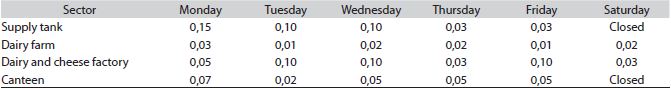 Water demand: The water flow requirements (m3*s-1) were measured on each water supply device for six production sites of figure 1, selected as the main consumers (dairy farm, dairy and cheese factory, pork and calf breeding, orchard and canteen). The different activities taking place on each sector were registered in detail including its frequency, water sources employed, and effluent disposal modes. Then, the total daily and weekly demands were calculated for each process via the corresponding time of scheduled activities. In the case of animal water consumption, data was obtained from previously reported data (Alarcón, Camacho, & Gallego, 2005; Almeyda, 2013).