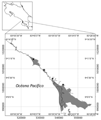 Se estableció en la medida de lo posible un punto de muestreo cada 10km aproximadamente para un total de cuatro estaciones de muestreo, en el río Morete (río Higuerón en la cartografía), quebrada Ballena, río Tortuga y río Coronado.