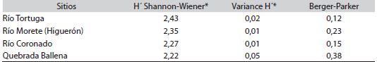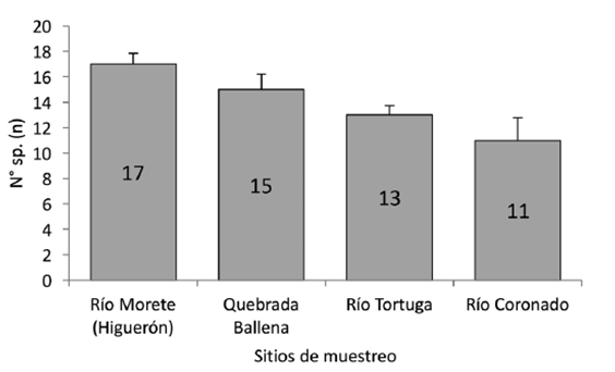 Riqueza: Se registró una diferencia estadísticamente significativa en la riqueza de especies entre los sitios de muestreo (Kruskall-Wallis H=7,88; g.l=3; p=0,0417), siendo el río Morete (Higuerón) el de más riqueza con 17 especies respecto a los otros lugares (p=0,04), mientras que el río Coronado registró la menor cantidad de especies (n=11; p=0,91) (Fig 2).