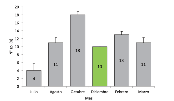 El registro de especies a lo largo del periodo de muestreo no presentó diferencias estadísticamente significativas (Kruskall-Wallis H=8,91; gl=5; 0,0978). Octubre fue el mes con mayor cantidad de registro de especies (Fig. 3).