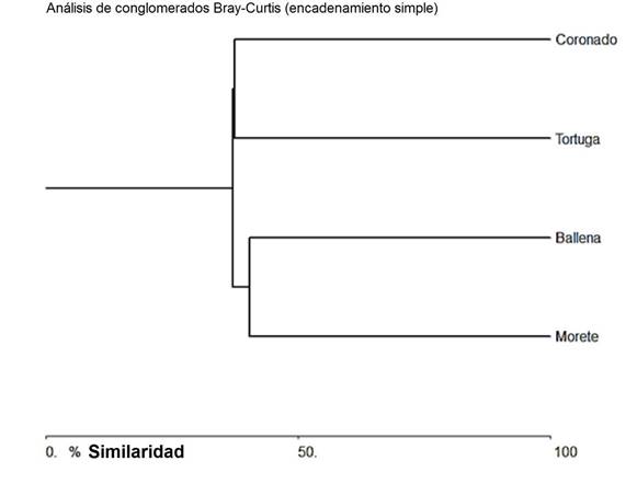 Distribución: La similitud/disimilitud en la composición de especies se reflejó mediante el Índice de similitud/disimilitud de Bray-Curtis sobre compartición de especies (Magurran, 1988), el cual se utilizó para un análisis de conglomerados por sitios utilizando unión simple de la distancia euclidiana; para estos análisis se utilizó el software para análisis estadístico InfoStat 1.1 (Balzarini et al., 2017).