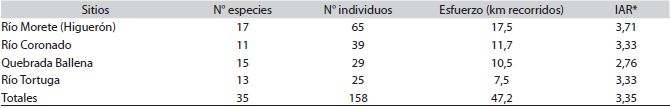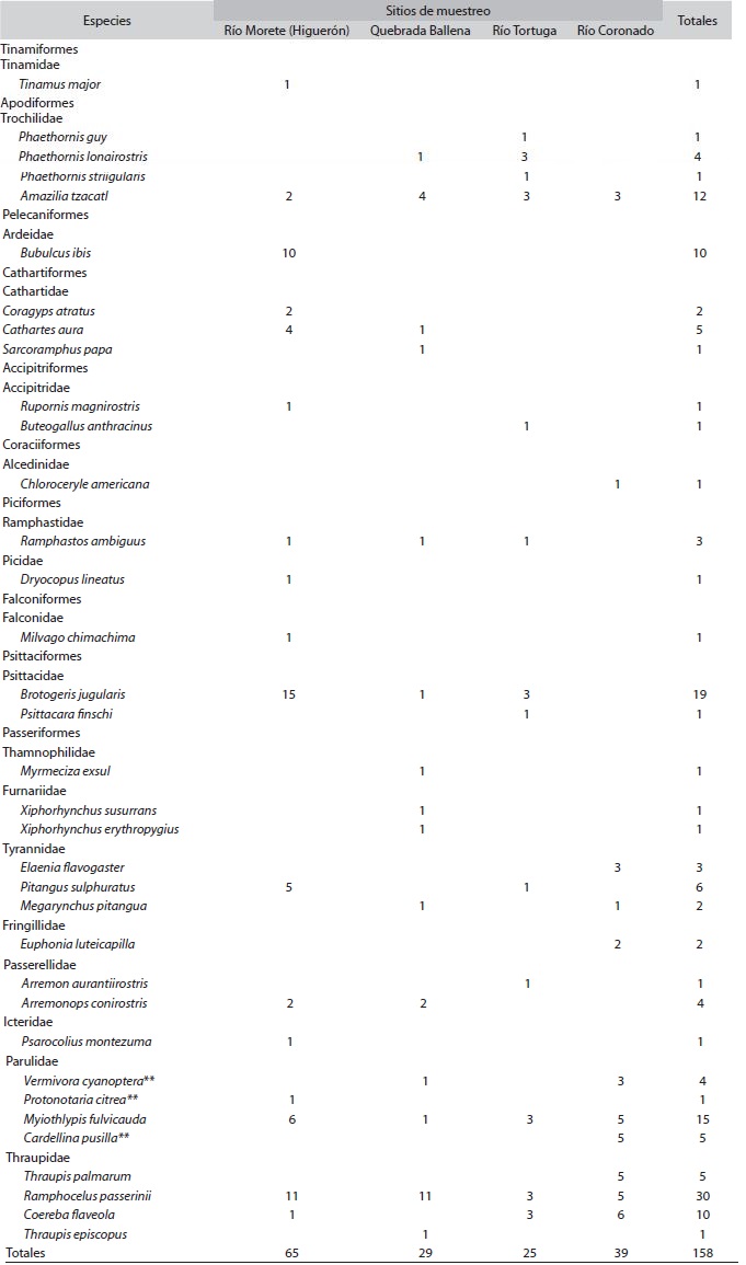 Este registro de aves en las zonas de protección de los ríos Morete, Ballena, Coronado y Tortuga coincide con Fletcher y Hutto (2006), autores que promueven como técnica de muestreo efectiva, barata y rápida el conteo de aves exclusivamente en ríos, considerando que estos hábitats son utilizados por la mayoría de las especies de aves, migrantes o no, reportando hasta un 90% de detección de la riqueza de una región.