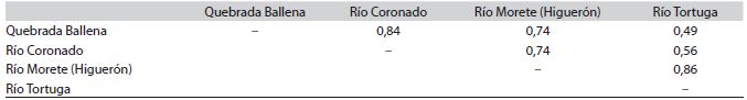Distribución: el reemplazo de especies entre sitios puede considerarse alto, registrándose la compartición en sus ensamblajes taxonómicos entre el sitio en el río Morete (Higuerón) y la quebrada Ballena en un 40,43%, siendo estos dos sitios los más similares; mientras el río Morete (Higuerón) y el río Coronado son los de mayor reemplazo de especies con una similitud de apenas el 25% (Cuadro 3, Fig. 4).