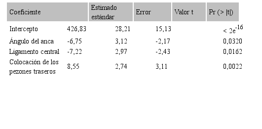 Para la raza Holstein, el ángulo del anca es una de las características que presenta diferencia significativa con respecto a la reproducción, de forma específica al número de servicios necesarios para la preñez. Las vacas con ancas niveladas requieren más servicios para lograr una preñez, lo que podría asociarse a una mayor producción de leche. Esto no es congruente con lo escrito en la literatura, ya que las vacas con ángulos intermedios tienen menor riesgo de desecho involuntario (que incluye los problemas reproductivos) (Caraviello et al., 2004). Por otra parte, las ancas altas son las que se asocian a problemas reproductivos, ya que los huesos del anca pueden no descender lo suficiente al momento del parto y provocar algún grado de distocia (Cue, Monardes, & Hayes 1990) y también aumenta la probabilidad de una infección porque la vagina no drena de forma efectiva después del parto (Astiz, González, Ayala, & Monge, 2002).