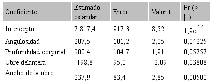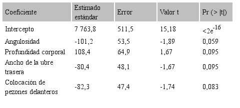 Características físicas que afectan de forma directa la producción de leche en una lactancia corregida a 305 días: En los Cuadros 11 y 12, se describen las variables físicas que influyen de forma significativa sobre la producción de leche para animales de la raza Holstein y Jersey respectivamente, donde se da una tendencia de las variables a conformar los componentes corporales y de ubre del semoviente. Un mayor puntaje en la característica de angulosidad de los animales, genera un efecto positivo en la producción de leche por lactancia en animales Holstein, mientras que, en animales Jersey, este efecto es negativo. En el caso de la profundidad corporal, el efecto de una mayor puntuación, genera un aumento en la producción de leche de 1,85 veces en animales Holstein que en animales Jersey. En el caso de altas calificaciones en el componente de ubres de las razas evaluadas, genera una reducción en la producción de leche en cada lactancia.