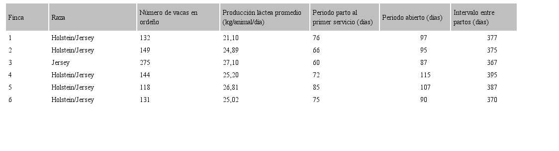 Este es un trabajo exploratorio realizado con información recolectada entre marzo del 2013 a marzo 2014, para determinar asociaciones entre las diferentes fincas, características físicas, la producción y reproducción de vacas Jersey y Holstein en lactancia en el área del Volcán Poás (10°11´51,42”N-84°13´40,68”O) (Cuadro 1). Esta zona presenta una precipitación promedio de 3 441mm anuales y 17,2°C de temperatura promedio anual, además la altitud va de los 1 650msnm hasta los 2 600msnm, humedad promedio del 86%, radiación solar de 16,2MJ, brillo solar de 5,2 horas por día (Mena, 2010). Las seis fincas participantes presentan un sistema de pastoreo rotacional en pasto Kikuyo (Kikuyuocloa clandestinum) asociados con trébol blanco (Trifolium spp) cada 28 días. El uso de un alimento balanceado con 16% de proteína cruda y 1,9Mcal de energía neta de lactancia, en una relación 2,5 a 1 (L de leche por Kg de alimento). Además, presentan similitud en el manejo sanitario (programas de vacunas y desparasitaciones) y reproductivo (palpaciones y protocolos de inseminación) del hato.