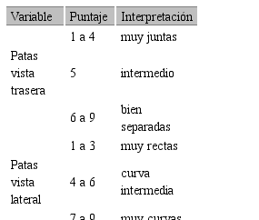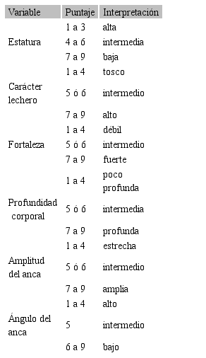 Técnica de evaluación lineal de las características de conformación y tipo: Para la evaluación lineal se utilizó el programa Select Mating Service (SMS)™. En donde, se observó de forma individual cada animal a incluir en la investigación, de dicha observación se obtuvo un valor para cada una de las 17 variables a evaluar, distribuidas en seis características físicas según cuerpo (Cuadro 2), tres en patas y pezuñas (Cuadro 3) y ocho en el componente de ubre (Cuadro 4), tales valores se califican en una escala de uno al nueve, sin utilizar decimales. Según el valor asignado a cada variable, esta se interpretaba según la información descrita en los cuadros 2, 3 y 4.