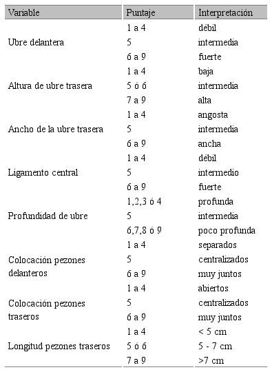 Los cuartos traseros llevan la mayor cantidad de leche, por eso la ubre trasera más ancha se relaciona de forma positiva con la producción de leche (Berry et al., 2004). La adecuada conformación de la ubre favorece la producción de leche y la vida productiva de las vacas (Schneider, Durr, Cue, & Monardes, 2003), un ejemplo es la puntuación intermedia de la ubre delantera con adecuada capacidad y sin largo excesivo formado por tejido adiposo no productivo. Los valores intermedios en el ligamento central son debido a que el peso de una ubre de una vaca alta productora provoca rompimiento del mismo, probablemente el mismo ligamento en una vaca de baja producción sea considerado como muy fuerte, pero por efecto de que sufre menos estrés por el peso de la leche. Otra razón por la que el ligamento central de fortaleza intermedia favorece la adecuada colocación de los pezones, se debe a que si es débil los abre y si es muy fuerte los cierra, lo que provoca problemas con el equipo de ordeño mecánico.