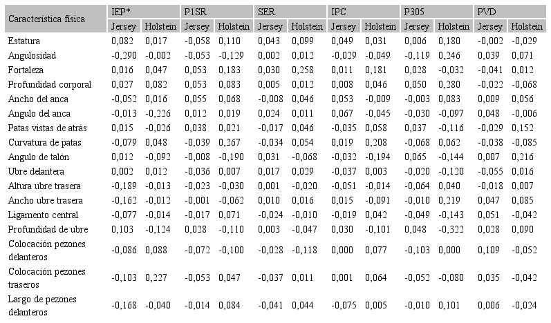 Correlaciones fenotípicas de las características de tipo con variables productivas y reproductivas: Las correlaciones obtenidas en esta investigación se presentan en el Cuadro 5 para las razas evaluadas, todas las correlaciones obtenidas son bajas, cercanas a cero y se dan entre las variables de tipo, reproducción y producción analizadas, lo que indica que hay poca asociación directa entre ellas. Se resalta en el Cuadro 5, que las variables que presentan correlaciones mayores a 0,15, en el caso del ganado Jersey se concentran en el intervalo entre parto, mientras que en los animales Holstein, estos valores se asocian a aspectos reproductivos como productivos.