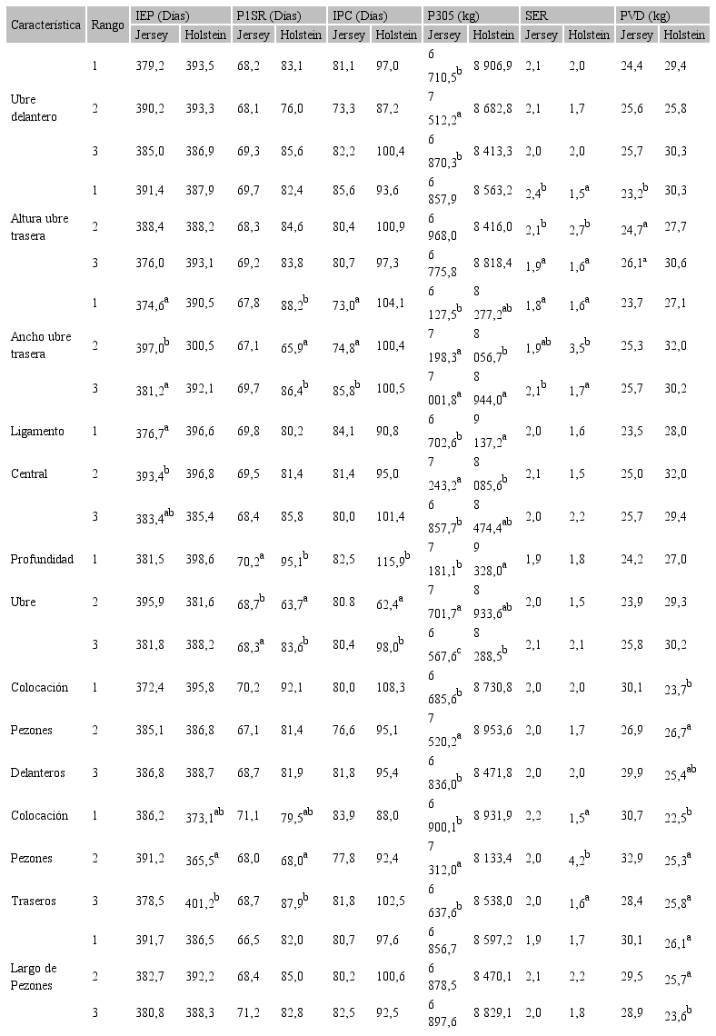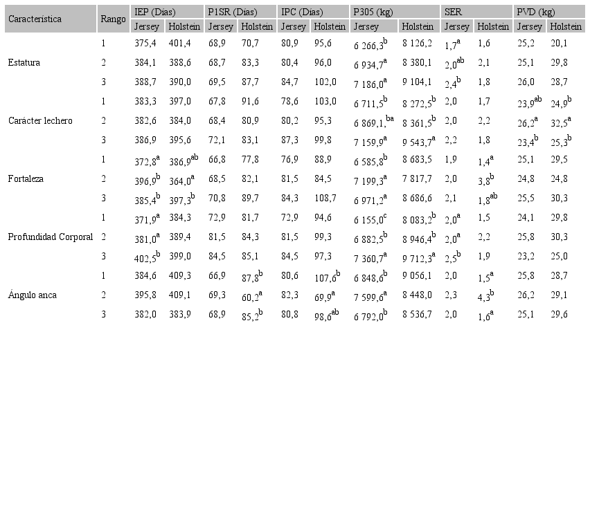 En cambio, para la raza Holstein, se obtuvo que el ángulo del anca, el ligamento central y la colocación de pezones traseros presenten un efecto. A mayor estatura los IEP son mayores en la raza Jersey. Animales más pesados tienen mayores problemas de patas y mayor requerimiento alimenticio. Hansen, Cole, Marx, y Seykora (1999), informaron que las vacas seleccionadas para ser de mayor talla no presentaron diferencias significativas en producción de leche al compararse con animales más pequeños; sin embargo, las vacas de mayor tamaño tienen menor vida productiva y más problemas reproductivos. La relación negativa entre las características de ubre y el intervalo entre partos, indica que los animales con mejores ubres son animales con IEP más cortos, debido a que las buenas ubres se asocian con menos problemas reproductivos, menos producción de células somáticas y vacas más saludables (Jones et al., 1994). En el caso de las puntas del anca, cuando se ubican más abajo que la cadera, esta posición permite una mayor facilidad de parto y que los movimientos del útero requieran menor tiempo de drenaje de tejidos y de líquidos, lo que ayuda a disminuir el intervalo entre partos (Rutter, 2002).
