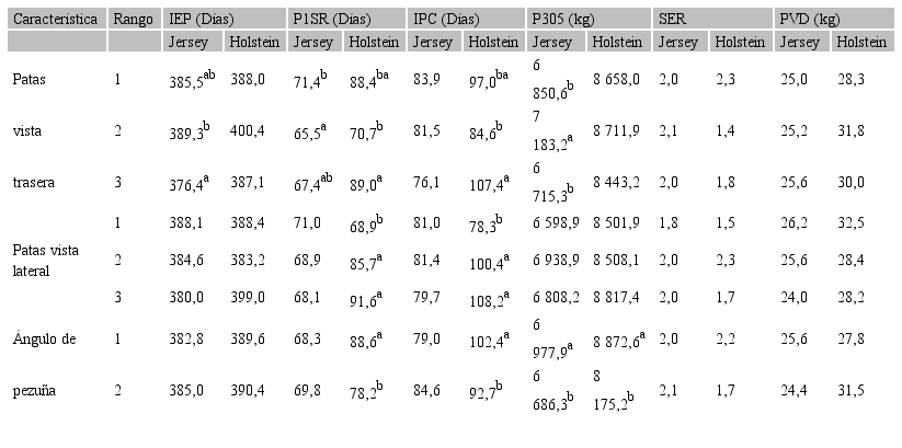 Relación de las características de patas y pezuñas sobre las variables productivas y reproductivas en animales Jersey y Holstein: Con la información contenida en el Cuadro 8, se nota que las patas traseras vistas desde atrás tanto en animales Jersey como en Holstein es una característica del componente de patas que afecta la producción y reproducción de las vacas, donde animales que presenten patas que no estén ni juntas (uno a tres) ni separadas (siete a nueve), presentan una tendencia a registrar una mayor producción de leche corregida a 305 días y requieren una menor cantidad de días para registrar un parto.