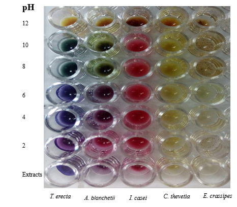 Halochromic properties of the crude extracts in pH range of 2-12: The halochromic properties of the various crude extracts from the flowers were examined at pH range of 2–2. The Fig. 2 shows that T. erecta and A. blanchetii extracts have distinct halochromic properties.