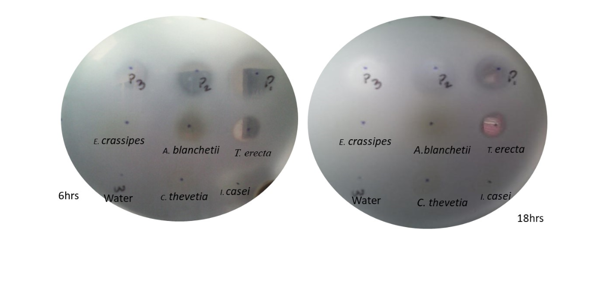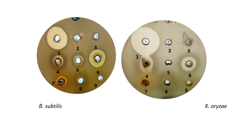 Comparison of the extracts on gram-positive Bascillus subtilis and gram-negative bacterium Xanthomonas oryzae pv. oryzae using top agar diffusion: All the extracts have some levels of inhibition against the gram-positive bacterium except C. thevetia. However, only T. erecta and A. blanchetii have antimicrobial activities against X. oryzea as shown in Fig. 5.