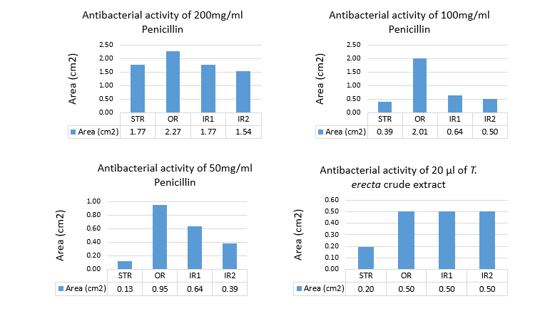 Based on the results obtained from this research, it can be concluded that the secondary metabolites from the crude extract of T.erecta is a promising antimicrobial candidate whose bioactive component can be exploited to aid in the fight against the rising problem of antimicrobial resistance. The absence of resistance ring by bacteria against T. erecta shows that the mode of action of this antimicrobial agent is different from that of penicillin. Isolation, purification and identification of the pigments from the crude extract of T.erecta would give better understanding of the active pigment responsible for these useful properties and add to the arsenal of molecules to fight antimicrobial resistance.
