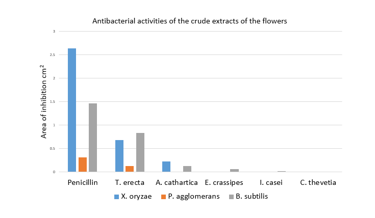 The mode of action of antimicrobial agents are classified into six:cell wall synthesis inhibition, protein synthesis inhibition, DNA synthesis inhibition, RNA synthesis inhibition, mycolic acid synthesis inhibition and folic acid inhibition (Hugo, 1967; Hahn, 2012) . Penicillin is a cell wall inhibitor (Wise & Park, 1965). Antimicrobial resistance of bacteria to penicillin is the production of enzymes capable of destroying the b-lactam ring of penicillin (Tenover, 2006). Once the penicillin is destroyed, resistance ring will form signifying clearance of the antibiotics and demonstrating the resistance status of the bacteria. The additional outer membrane layer of gram-negative organisms differentiates them from gram-positive organisms. This provides additional protection and thereby enhancing survival during stress conditions (Schwechheimer & Kuehn, 2015). The Fig. 3 and Fig. 5 show the gram-negative P. agglomerans and X. oryzae respectively resisting some of the flower extracts while the gram-positive, B. subtilis, was susceptible to all the extracts except C. thevetia.