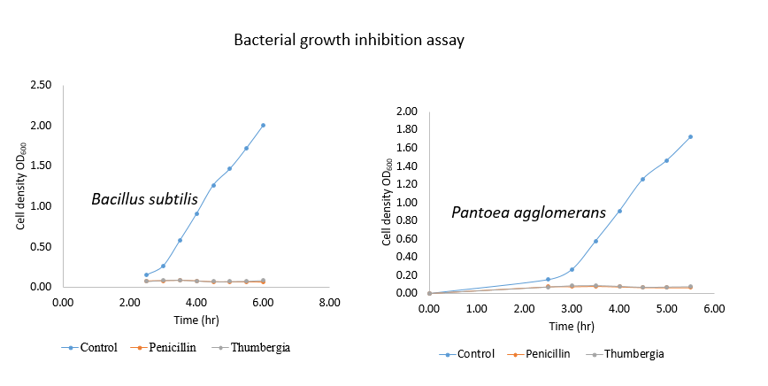 Antimicrobial activity: Thunbergia erecta is one of the common species of Thunbergia (Sultana, Chatterjee, Roy, & Chandra, 2015). Members of these species have been found to have antimicrobial activities against both gram positive and gram negative bacteria (Jeeva, Johnson, Aparna, & Irudayaraj, 2011; Jenifer, et al., 2014; Kosai, Jiraungkoorskul, & Jiraungkoorskul, 2015). The anti-microbial activities of T. erecta against Panteoa agglomeran and Xanthomonas oryzae are remarkable. Pantoea agglomerans and Xanthomonas oryzae pv. oryzae are both pathogens of rice cultivation (Salzberg et al., 2008; Lang et al., 2010; Lee et al., 2010) . They are rod-shaped, gram-negative bacteria found in both temperate and tropical parts of the world and cause 10-50% yield losses. Recently, Pantoea agglomerans were discovered to be the plight of farmers on wild rice Oryza longistaminata plants near Tanguiéta town, at Pendjari National Park, northwest Benin republic (Afolabi et al., 2016; Kini et al., 2017).