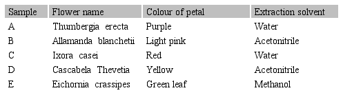 Extraction of the pigments with aqueous and organic solvents: The pigments in the various petals of the selected ornamental plants exhibited different solubility in water, methanol and acetonitrile. For each flower, the most compatible solvent on the basis of level of solubility and retention of original colour, was selected as shown in Table 1.