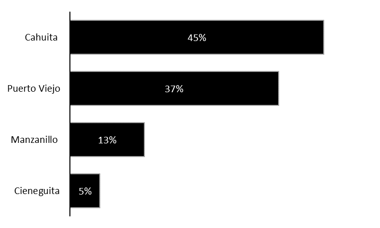 Por otra parte, con base en las entrevistas realizadas a los dueños de restaurante, distribuidos a lo largo de la costa Caribe sur, siendo Cahuita la zona en la que hay más restaurantes (Fig. 9). Se entrevistó a: propietarios, administradores y empleados, de los cuales, el 15% asegura que al menos en una ocasión los clientes han solicitado platillos a base de pez León; sin embargo, solamente el 3% hizo un cambio en su oferta gastronómica al incorporarlo dentro del menú; el pez León se prepara: frito, acompañado con patacones, en ensalada, en arroz, en sopas y otras opciones. En otras palabras el 97% de los restaurantes no ha realizado un cambio en su oferta gastronomica, para introducir al pez León.